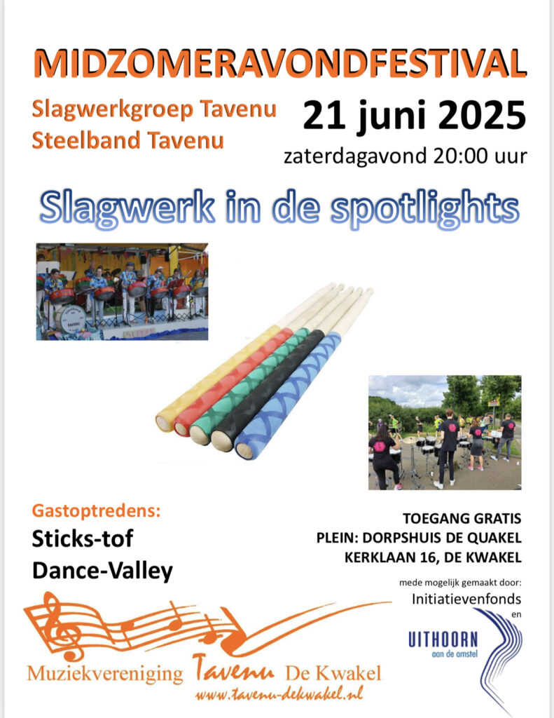 Het midzomeravondfestival van Tavenu vindt dit jaar plaats op zaterdag 21 juni. Deze avond staat het slagwerk in de hoofdrol.