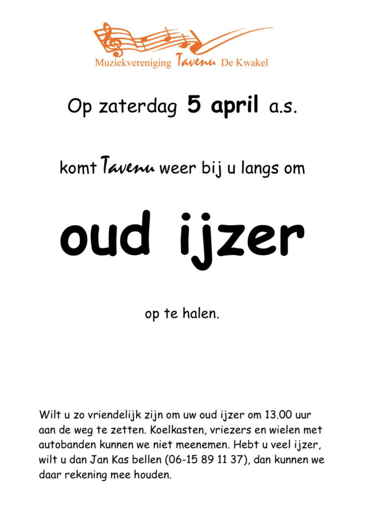 Zaterdag 5 april a.s. komen leden van TAVENU weer oud ijzer ophalen in de gebruikelijke wijken van De Kwakel en Vrouwenakker.